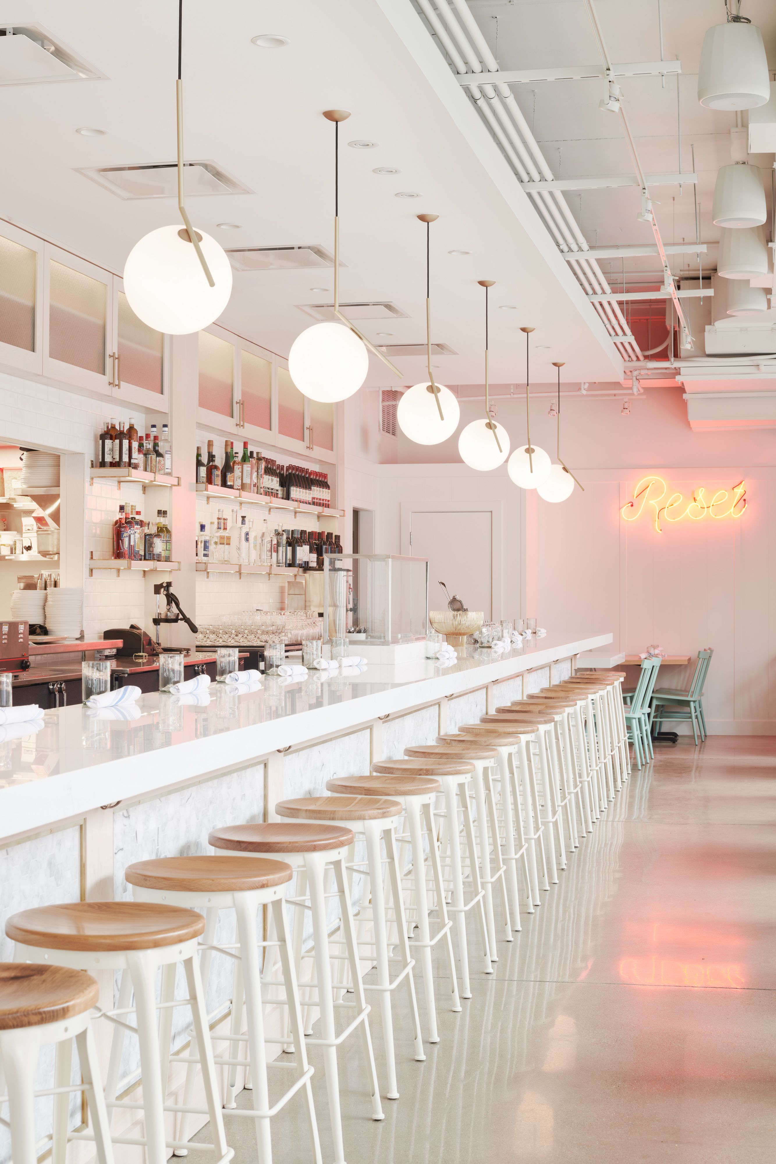 The light airiness created by engaging coastal colors is intended to sweep guest away, allow them to disconnect and leave feeling refreshed. Designing crisp, clean surfaces in materials that could hold up to the salty air and wind, transport guests to a welcoming oyster bar on the coast. The nautical geometry in fresh colors were developed from ocean waves and the lighting fixtures above the bar are reminiscent of oyster pearls.